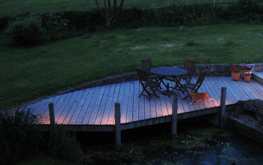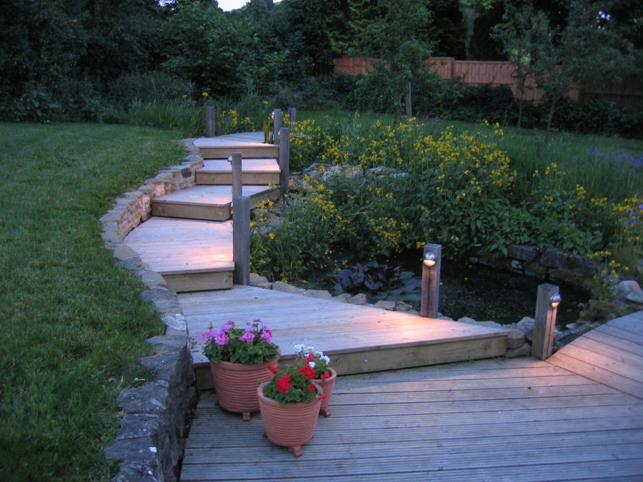 Features: Decking walkway and terrace, natural stone paving, garden lighting, natural stone retaining wall