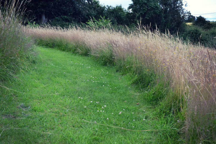 Planting: Cottage garden planting, wildflower meadow with mown paths, loose style