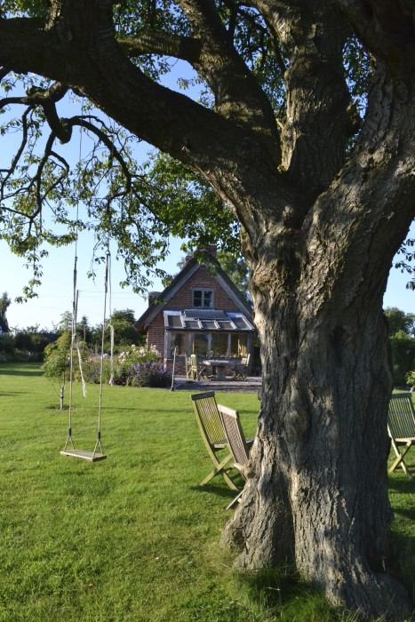 Features: Natural sandstone paving, tree swing, stone pathway.