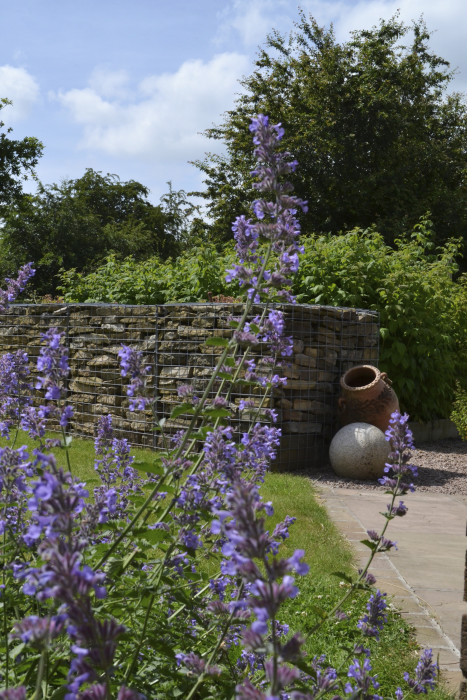 Features: Gabion wall and seating (reclaimed materials from site), geodesic greenhouse, raised vegetable beds, terrace natural stone paving with blue brick edging.