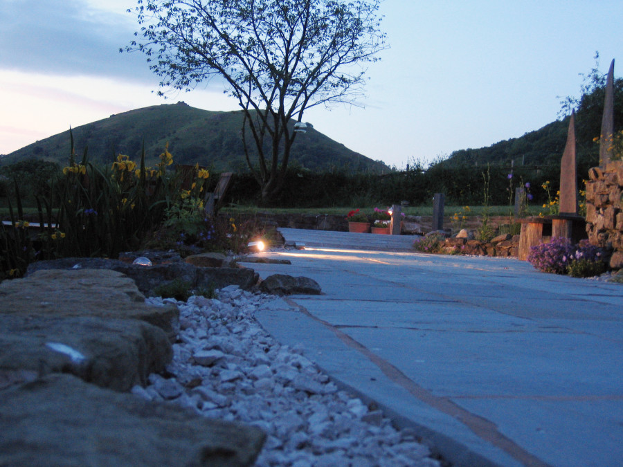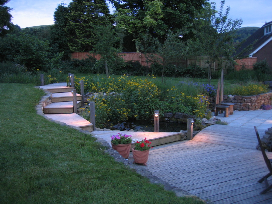 Features: Decking walkway and terrace, natural stone paving, garden lighting, natural stone retaining wall