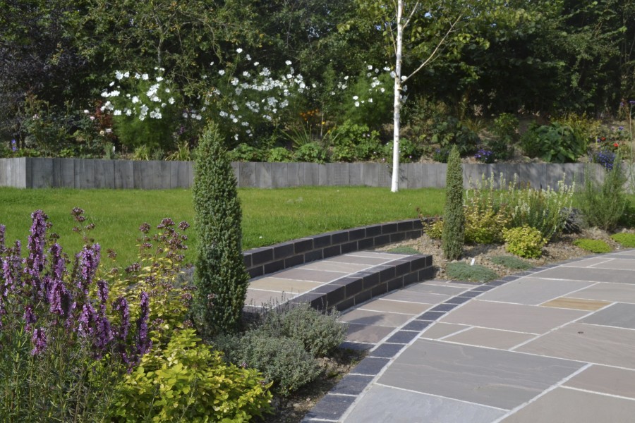 Features: A bespoke Star gazers observatory with sliding roof. Curved lawn design, natural stone paving with blue brick edging, curved oak retaining wall, which as well as extending the planting space, added more levels to the garden and a flatter lawn. A sitting area, which was placed in a sunny, sheltered position with fantastic views.